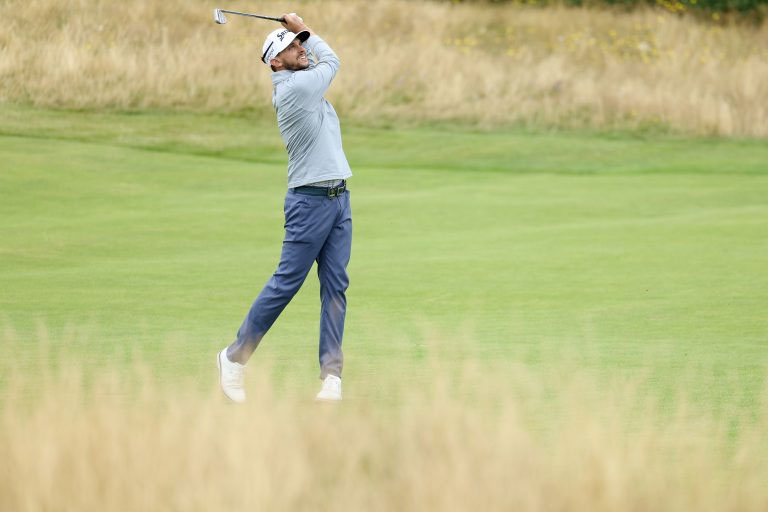 US golfer Andy Ogletree watches his iron shot from the 14th tee during his third round, on day three of the 152nd British Open Golf Championship at Royal Troon on the south west coast of Scotland on July 20, 2024. (Photo by ANDY BUCHANAN / AFP) / RESTRICTED TO EDITORIAL USE (Photo by ANDY BUCHANAN/AFP via Getty Images)