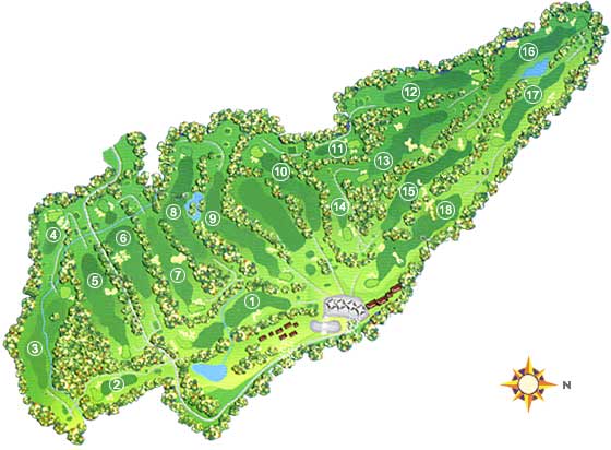 The 18-hole championship golf course was designed by Australians Peter Thompson and Michael Wolveridge in 1974. Mature tree-lined fairways, indigenous flowers, and Bent grass greens characterize the layout. Notable holes include the 3rd a long 435 yard par-4 that pays downhill to a 90-degree dogleg to the right. The creek along the right side of the fairway prevents cutting over the dogleg and the left side is well guarded by bushes. Driving accuracy is a must to par this hole. The second shot must carry across the water with a long iron to the green.