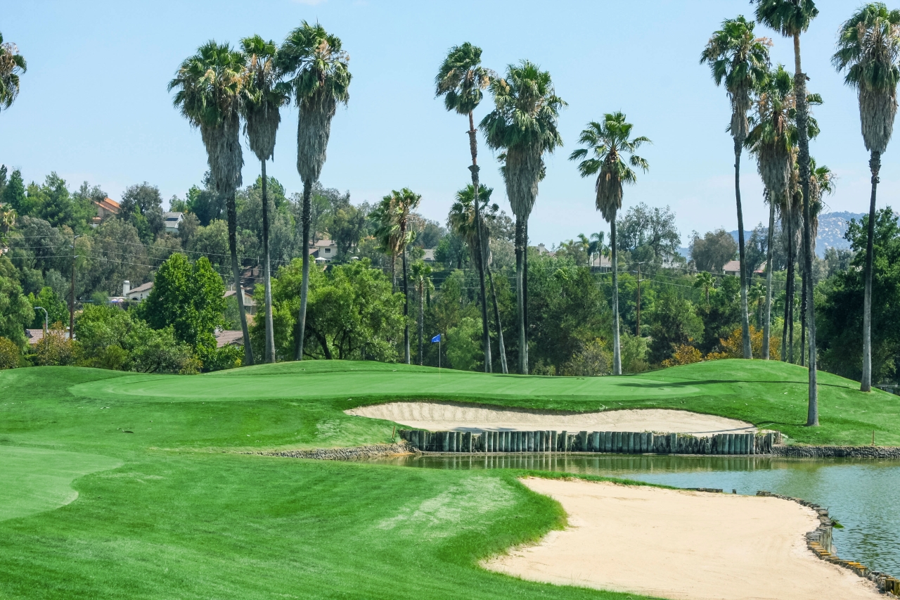 The signature par-5 6th plays from an elevated tee, with two routes to the green on the second shot. The cautious 'lay-up and pitch-on in three' is available. The riskier carry over water and 'on in two' strategy temps better golfers.