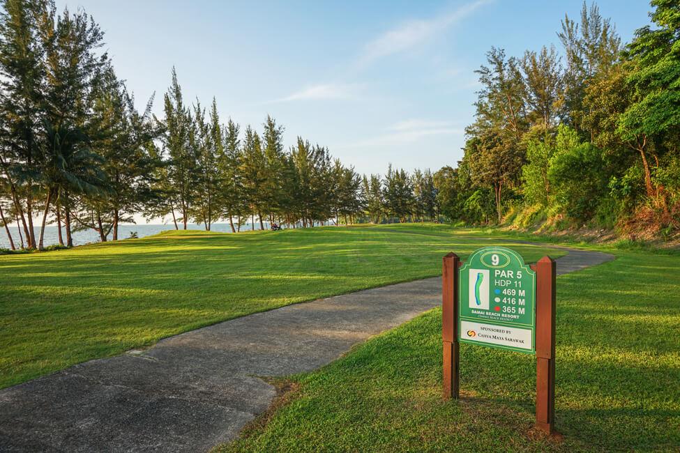 Damai consists of the Mountain Nine and the Ocean Nine which are remarkably different in character. The front Mountain Nine offers challenging golf in a rugged, natural rainforest setting. It follows the contours of mountain foothills. The back Ocean Nine hugs the South China Sea and features scenic fairways and beautiful beaches with the coastal ranges in the distance. Greens are generally small and favor accurate approach shots.